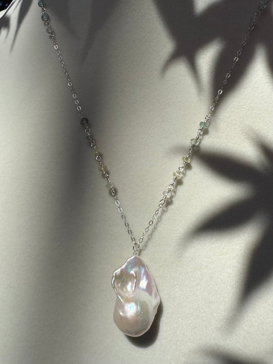 Willa - White Baroque Flameball Pearl Pendant with Wire Wrapped Aquamarines in Sterling Silver